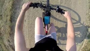 Naked and horny in public POV – Riding nude in nature, shaved body, masturbation until cumshot